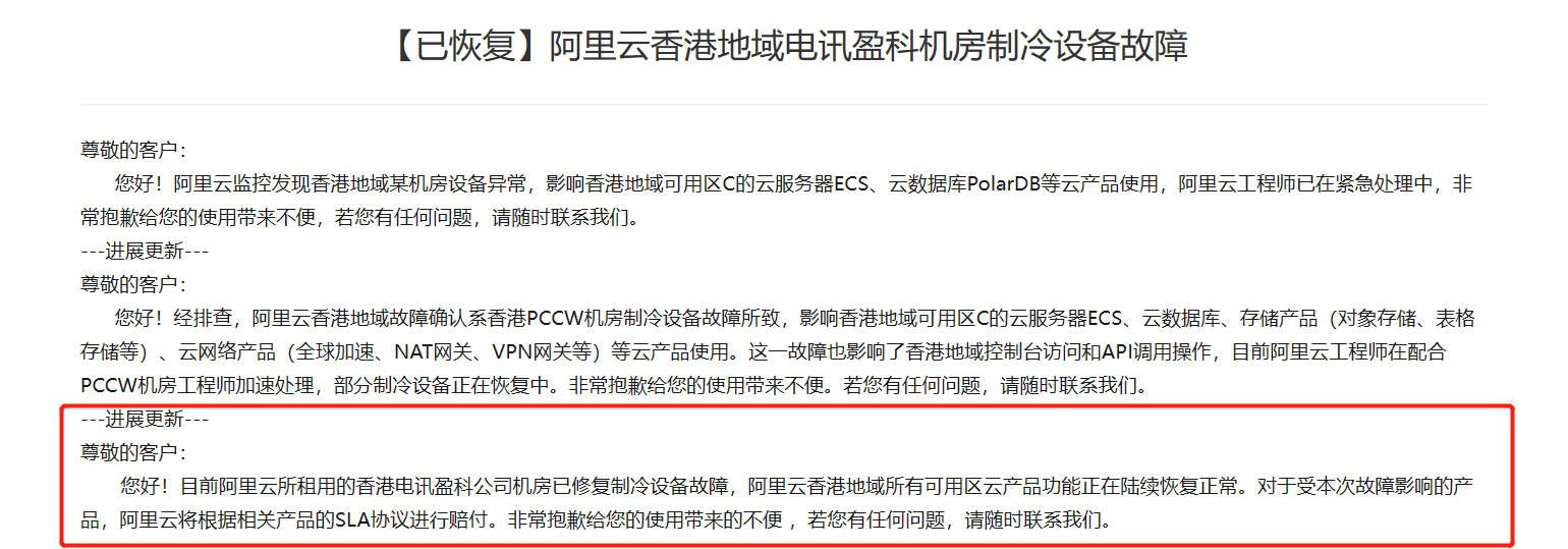 12月19日消息,阿里巴巴旗下的雲服務平台阿里雲在官網更新了機房製冷設備故障的公告,目前阿里雲所租用的香港電訊盈科公司機房已修復製冷設備故障,阿里雲香港地域所有可用區雲產品功能正在陸續恢復正常。對於受本次故障影響的產品,阿里雲將根據相關產品的SLA協議進行賠付。