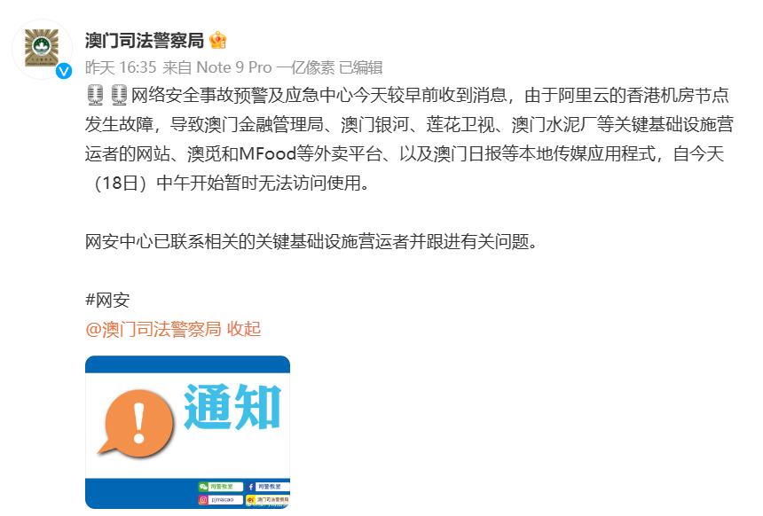 12月18日,澳門司法警察局官方微博賬號發佈消息,稱“由於阿里雲的香港機房節點發生故障,導致澳門金融管理局、澳門銀河、蓮花衞視、澳門水泥廠等關鍵基礎設施營運者的網站、澳覓和MFood等外賣平台、以及澳門日報等本地傳媒應用程式,自今天(18日)中午開始暫時無法訪問使用。 ”