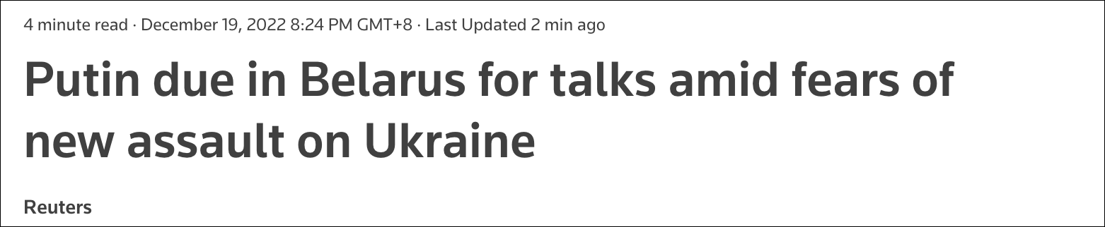 路透社注意到,俄白兩國加強溝通也引發了烏克蘭方面的擔憂。烏克蘭武裝部隊總司令扎盧日內(Valery Zaluzhniy)早前接受英國《經濟學人》雜誌採訪時稱,俄羅斯正在準備在烏克蘭戰場再投入20萬人的部隊,俄羅斯最早可能在1月份從烏東部、南部甚至白俄羅斯方向發起重大攻勢,不過在春季發起攻勢的可能性更大。