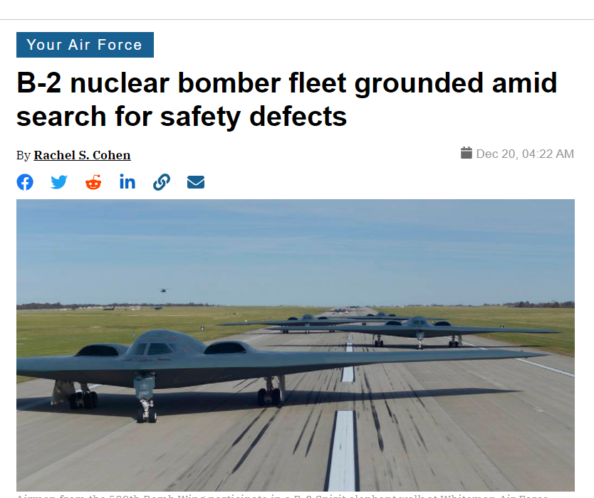 此前12月16日,懷特曼發佈了一份新聞稿,稱該部隊已經對整個B-2機隊進行了無限期的安全暫停檢查,這意味着這些轟炸機也不會參加美國年度大學橄欖球季後賽的飛行表演。