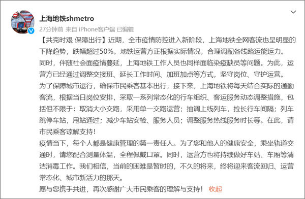 為了保障城市運行,確保市民乘客基本出行,接下來,上海地鐵將每天結合實際的通勤客流,根據當日崗位安排,採取一系列常態化的行車組織、客運服務動態調整措施,包括但不限於:取消大小交路,採用單一交路運營;抽調上線列車,拉長行車間隔;列車跳停車站,甩站通過;減少車站安檢、服務人員;調整服務熱線服務時長等。在此,請市民乘客諒解支持!