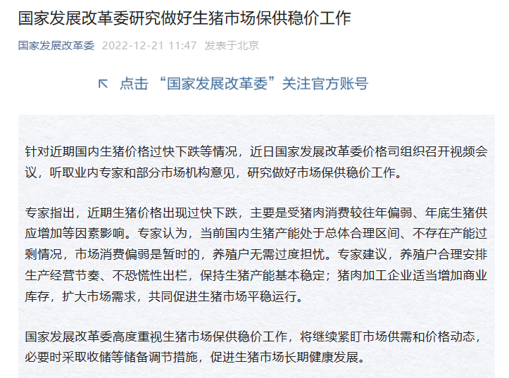 微信公眾號“國家發展改革委”12月21日消息,針對近期國內生豬價格過快下跌等情況,近日國家發展改革委價格司組織召開視頻會議,聽取業內專家和部分市場機構意見,研究做好市場保供穩價工作。