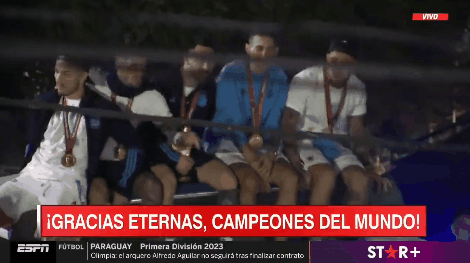 之後,球員們坐上一輛敞篷大巴車,這輛大巴車將把他們帶到阿根廷足協的訓練中心過夜。雖然已是凌晨,但仍有成千上萬球迷舉着橫幅、旗幟等在路邊,迎接梅西和隊友。經歷了長途飛行的球員們也仍然興高采烈,他們站在巴士頂部向喜愛他們的球迷揮手,巴士一側寫着“世界冠軍”。