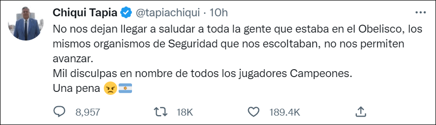 對此,阿根廷足協主席克勞迪奧·塔皮亞(Claudio Tapia)隨後發佈推文,向球迷致歉。“他們不讓我們向所有在方尖碑前的人打招呼,護送我們的安全部隊不允許我們繼續前進。我代表所有冠軍球員們道歉。”