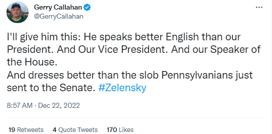 波士頓一家體育電台的主持人格里·卡拉漢(Gerry Callahan)在推特發文,諷刺拜登的同時順便踩了下哈里斯、佩洛西和民主黨參議員約翰·費特曼(John Fetterman):“我得承認:他英語説得比我們的總統好,也比副總統和眾議院議長好。而且他穿得比賓夕法尼亞州剛送進參議院的邋遢鬼好。”