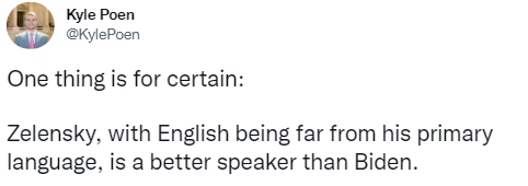 美國一家反墮胎組織的區域協調員凱爾·普恩(Kyle Poen)稱,這位母語非英語的烏克蘭領導人的英語演講能力超過了80歲的拜登。