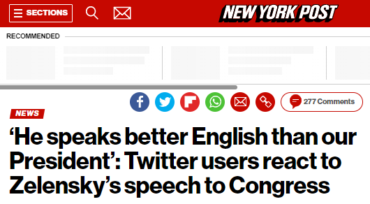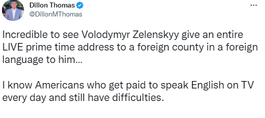 “令人難以置信的是,澤連斯基在他國用外語作了一個完整的黃金時段直播的演講。我認識一些拿工資在電視上説英語的美國人,他們完成此事都有困難。”
