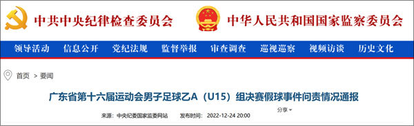 中央紀委國家監委網站12月24日通報,2022年8月7日下午,廣東省第十六屆運動會男子足球乙A(U15)組決賽發生假球事件。經廣東省委批准,省紀委監委成立調查組,查明事實真相,對事件中存在的履職不力、失職失責問題深入開展調查,堅持失責必問、問責必嚴,堅持依規依紀依法,堅持實事求是、科學精準,對16名黨員領導幹部嚴肅問責。