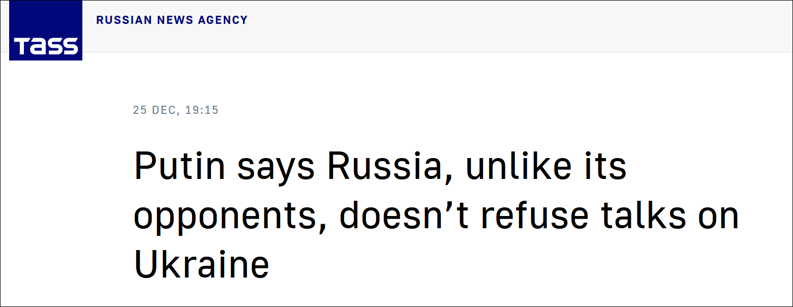 普京22日在克里姆林宮與媒體代表進行交流時再度提及,所有的衝突都會以某種方式通過談判解決,衝突各方早晚都會進行談判,俄羅斯從來沒有拒絕談判。俄羅斯的目標不是加速俄烏衝突,而是結束這場衝突,而且是越快越好。