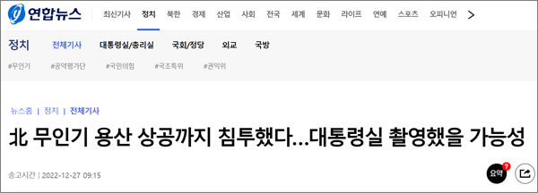 韓國聯合參謀本部(聯參)26日表示,韓軍從當天上午10時25分起在京畿道一帶捕捉到多條疑似朝鮮無人機航跡。韓軍共識別到5架朝鮮無人機,首先捕捉到的1架進入金浦和坡州之間的漢江中立水域,隨後直接飛往首爾北部地區,之後離開首爾返回朝鮮。其餘4架從江華島西側飛入,在江華島地區展開活動。韓軍認為,該4架無人機的目的在於分散韓軍注意力。據悉,該4架無人機消失在韓軍探測範圍後,航跡未再出現。