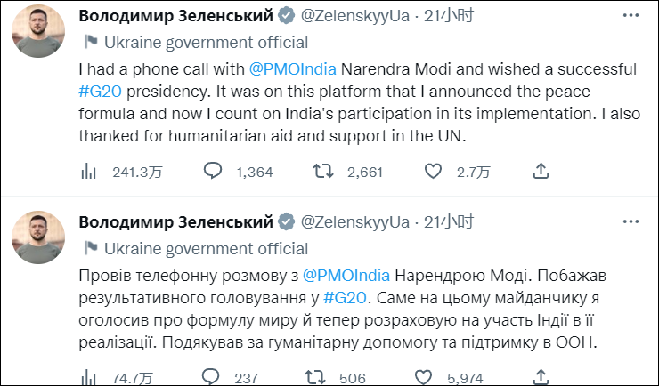 澤連斯基在26日發佈稱:“我同印度總理莫迪通話,祝賀印度成功擔任二十國集團(G20)主席國。在G20峯會上,我宣佈了和平方案,現在,我希望印度能參與進方案的實施。”