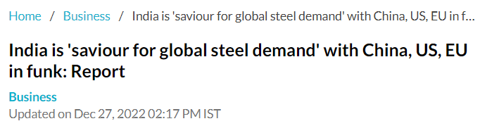 印媒認為:“由於中國龐大的建築業仍處於低迷狀態,而美國和歐洲可能陷入衰退,印度已成為全球鋼鐵需求低迷的救世主(India has emerged as a saviour for flagging global steel demand)。”