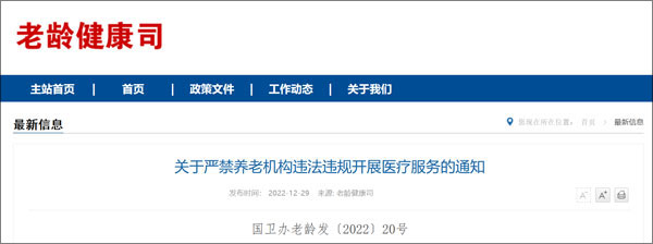 國家衞健委網站12月29日發佈《關於嚴禁養老機構違法違規開展醫療服務的通知》。
