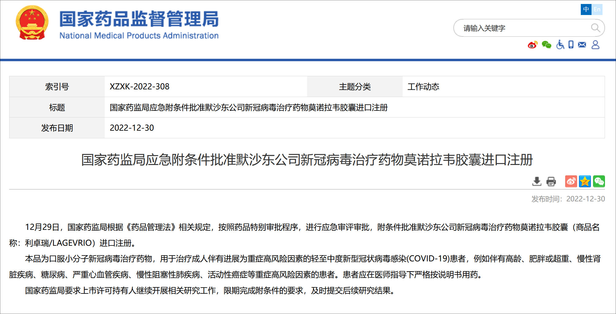 國家藥監局網站12月30日消息,12月29日,國家藥監局根據《藥品管理法》相關規定,按照藥品特別審批程序,進行應急審評審批,附條件批准默沙東公司新冠病毒治療藥物莫諾拉韋膠囊(商品名稱:利卓瑞/LAGEVRIO)進口註冊。