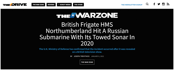 “戰區”還援引了一份關於“諾森伯蘭”號護衞艦在2020年9月至12月期間開展行動的官方新聞稿説,當時該艦是英國“伊麗莎白女王”號航母編隊中的一員,但新聞稿中沒有提到這次碰撞事故以及該護衞艦的維修情況。不過“戰區”認為,這似乎就能解釋為什麼會發生碰撞事件,俄羅斯的潛艇當時正在跟蹤監視“伊麗莎白女王”號航母編隊。