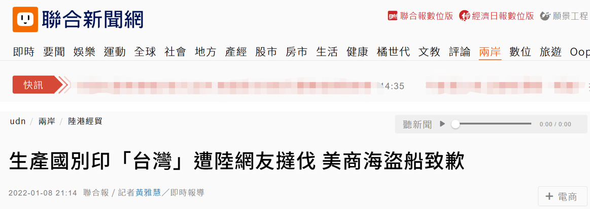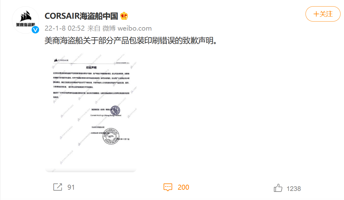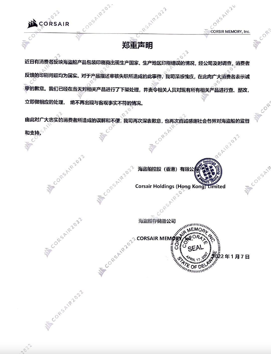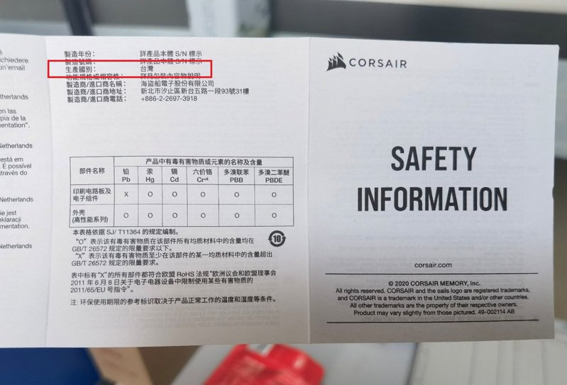 【環球網報道】據台灣《聯合報》8日消息,近日有大陸網友發現美國電腦硬件及外設公司“Corsair海盜船”(以下簡稱海盜船)的內存產品把“生產國別”印為“台灣”,引發網友質疑。對此該公司中國總代理“海盜船中國”於8日凌晨發佈道歉聲明,聲明提到相關大陸電商下架了相關產品。