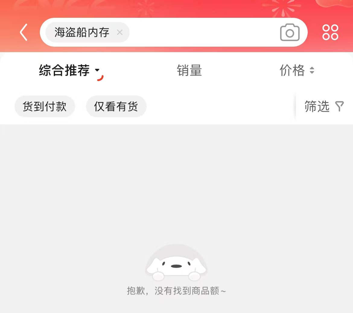 據本網記者在京東手機App搜索“海盜船內存”,確實未搜索到相關結果,該公司其他產品仍可搜到。