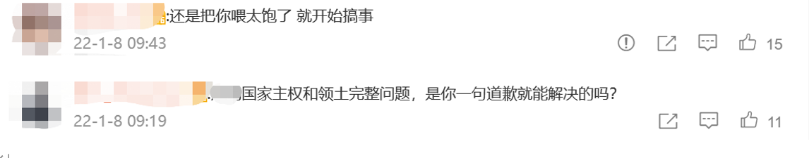 還有網友表示,“還是把你喂太飽了,就開始搞事”、“國家主權和領土完整問題,是你一句道歉就能解決的嗎?↓