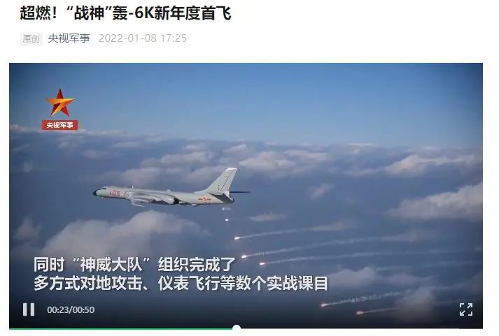 新年度首個飛行日的飛行演訓中,怎麼會少了“戰神”轟炸機的身影呢?據央視軍事8日的另一篇報道,解放軍中部戰區空軍航空兵某師“神威大隊”組織重難點課目專攻精練。數架轟-6K戰機呼嘯升空,飛赴不同空域展開多課目訓練。尖刀機組率先抵達指定靶區,機組成員密切協同,實施精準轟炸,成功摧毀目標!