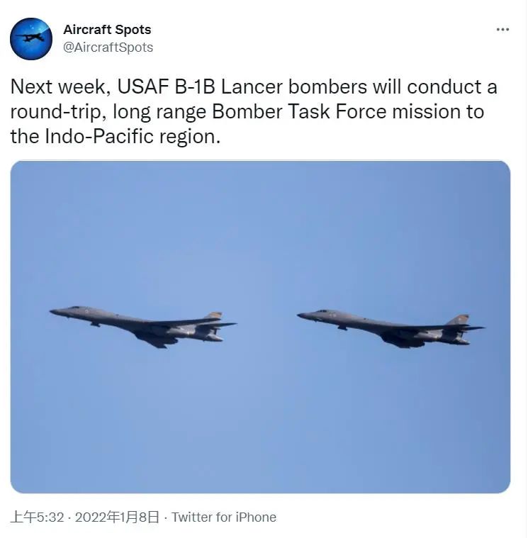 雖然中國周邊海空域近來似乎比較消停,並沒有太多美軍艦機的動靜,但這可能只是因為他們正在延續聖誕假期。2022我們一定不能掉以輕心。“飛機守望”推特賬號8日發佈消息稱,下週,美國空軍的B-1B轟炸機將前往印太地區執行一次遠程轟炸機特遣部隊任務。