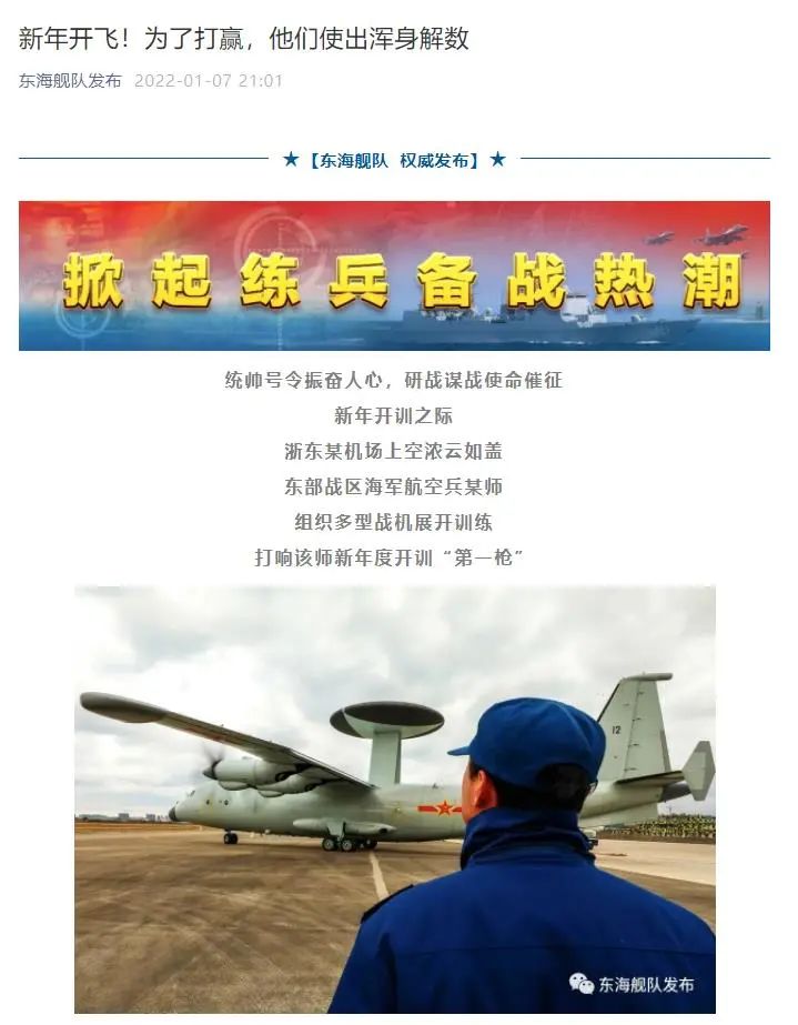 根據解放軍東海艦隊官方微信公眾號“東海艦隊發佈”7日的消息,新年開訓之際,東部戰區海軍航空兵某師組織多型戰機展開訓練。根據報道,出動的軍機至少包括預警機與反潛巡邏機。據該師領導介紹,新年度他們將圍繞體系對抗加強針對性研究,不斷深化戰訓耦合、提高體系作戰能力。