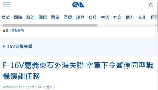 報道稱,台空軍嘉義基地一架F-16V單座戰機(機號6650),下午2時55分由飛行員陳奕駕機起飛執行例行性訓練任務,3時23分在水溪靶場周邊光點消失,有民眾目擊戰機於鰲鼓濕地北堤西側墜入海面。台空軍已成立應變中心,展開搜救行動。