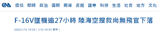 據報道,台灣搜救中心今晚發佈新聞簡訊稱,11日下午15時32分接獲台防務部門通報,稱台空軍一架F-16V單座戰鬥機於同日下午15時25分在嘉義東石外海雷達光點消失,飛行員上尉28歲陳奕失蹤,隨即出動陸海空兵力積極搜救。