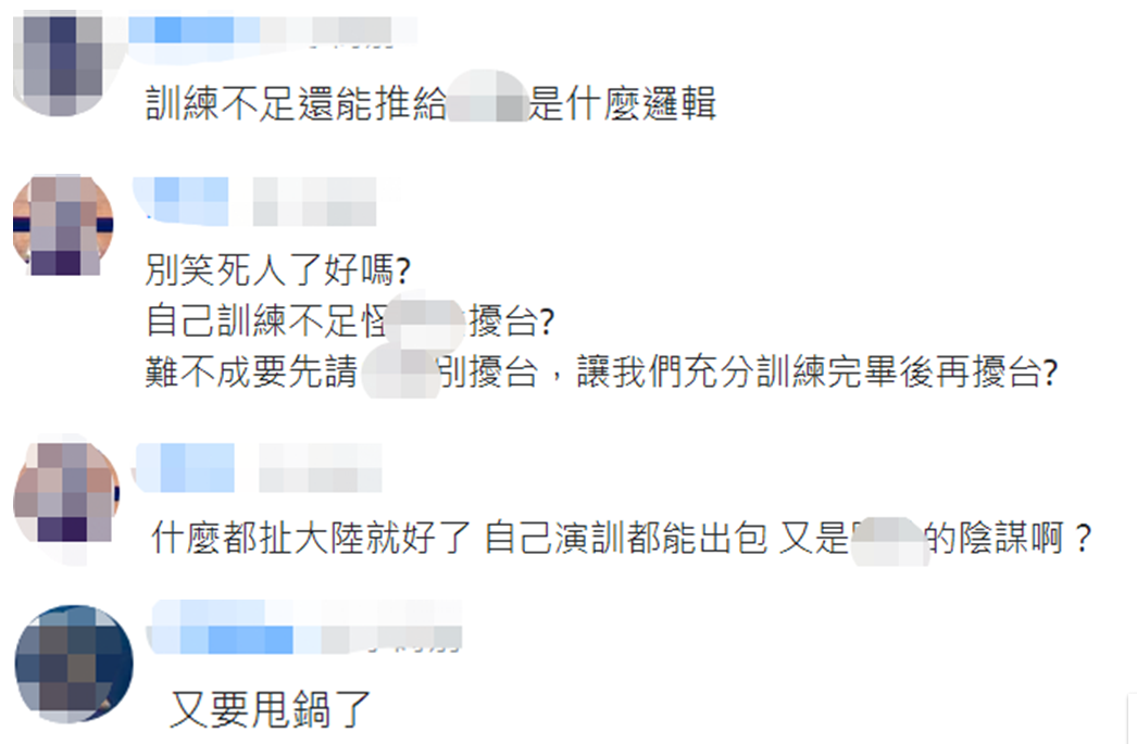 對於張延廷此次的一番説辭,有島內網友説,將台軍訓練不足推給大陸,什麼都扯上大陸沒邏輯,“又要甩鍋了”。↓