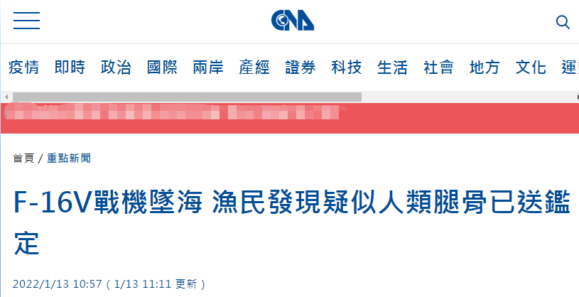 台媒:台軍持續搜救F-16V戰機,漁民發現疑似人類腿骨已送鑑定