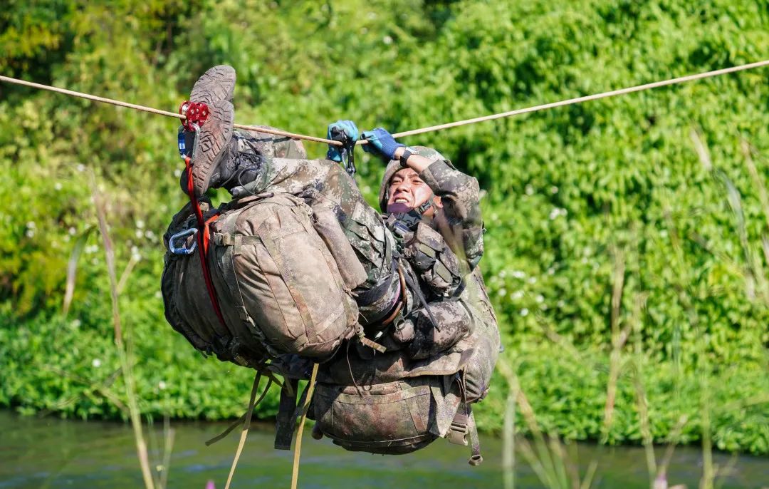 面對十餘米寬的河流,第四小隊隊長張飛昊迅速按照分工渡河。橫越河面的繩索設置完成後,第一名隊員率先過河。突然,他的緊繩器斷裂,人停在河中央上方。