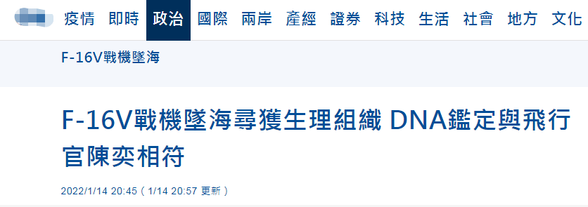 【環球網快訊】據台灣“中央社”剛剛消息,台軍F-16V戰機11日墜海,飛行官陳奕失蹤,搜救人員在失事地點發現零星身體組織,今天(14日)檢驗比對DNA,報告結果晚間出爐,與飛行員陳奕的母親存在親緣關係,確定為失蹤飛行員本人的身體組織。