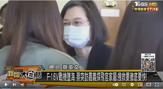 島內政論節目“新聞大白話”13日發佈的一期節目爆料,台軍F-16V戰機墜海,失蹤飛行員仍未找到,蔡英文當天到台空軍嘉義基地瞭解蒐集情況並探望失蹤飛行員家屬。主持人展示了一段由蔡英文辦公室提供的她慰問家屬的畫面,視頻前半部分蔡英文探望失蹤飛行員家屬時向台軍方下令,“搜救的事情要做徹底、速度要快”云云,然而視頻的後半部分明顯被做了消音處理。
