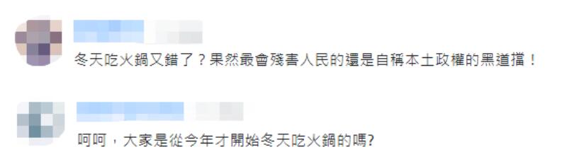 對於台電的説辭,有島內網友不以為然,紛紛在台媒評論區留言嘲諷。有人問,“冬天吃火鍋又錯了?”“呵呵,大家是從今年才開始冬天吃火鍋的嗎?”