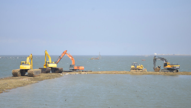 報道稱,16日重型機械進場,水陸兩用挖掘機、推土機進駐水溪靶場內臨時整建的海堤,一艘抽砂船已拖至失事水域附近,準備打撈。