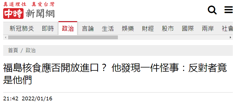 報道稱,民進黨當局研擬日本福島核災食品解禁,傳出為避免福島五縣市食品引發恐慌,研擬以“福食”取代“核食”。民進黨立委趙天麟16日受訪時聲稱,經過萊豬(含萊克多巴胺的美國豬肉)“公投”後,台灣社會更趨於成熟,不能一概而論把日本福島相關食品簡稱為核食,清楚定義正名是有必要的。