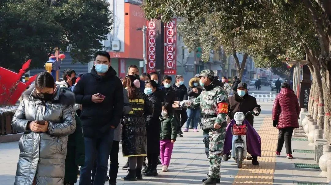 2021年12月底至2022年1月初,陝西部分地區疫情再起。圖為咸陽禮泉縣退役軍人志願者在核酸檢測現場秩序維持。