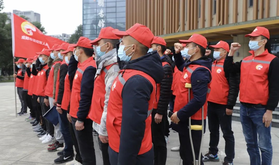 2021年11月,成都市退役軍人戰旗紅志願服務總隊支援疫情防控前合影。