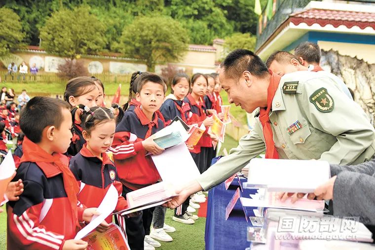 貴州省福泉市高坪小學“兵校長”樊德剛為學生髮放學習用品和國防教育書籍資料。蘭國洪攝