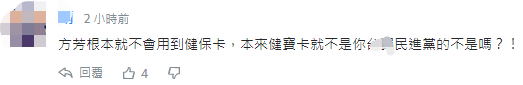 還有網友直斥,“方芳根本就不會用到健保卡,本來健保卡就不是你‘台獨’民進黨的不是嗎?”↓