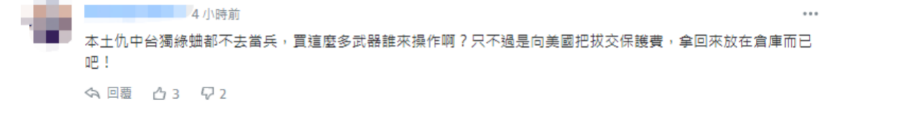 也有網友直斥:島內“仇中台獨”的人都不去當兵,“買這麼多武器誰來操作啊?只不過是向美國把拔交保護費,拿回來放在倉庫而已吧!”↓