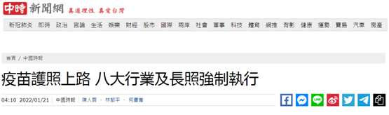 “中時新聞網”稱,基於現在島內外疫情嚴峻,且島內疫苗涵蓋率已達一定程度,台流行疫情指揮中心20日宣佈,島內版“數字新冠病毒健康證明(俗稱疫苗護照)”今天上午8時起開放民眾申請使用。