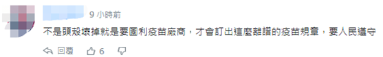 有網友就表示,“不是頭殼壞掉就是要圖利疫苗廠商,才會定出這麼離譜的疫苗規章,要民眾遵守”↓