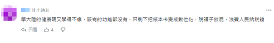 另外,關於民進黨當局推出島內版“疫苗護照”,有網友直言,“學大陸的健康碼又學得不像,該有的功能都沒有,只剩下把紙本卡變成數字化,浪費人民納税錢”“笑死人的民進黨,還偷學人家的綠黃紅健康碼,打了疫苗就健康嗎?偷學還學的不三不四”。↓