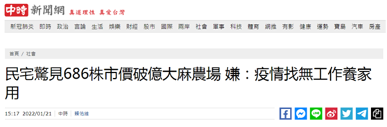 據報道,警方專案小組等部門20日前往新北市一民宅搜查,在民宅的3至5層的9個房間內查獲686株大麻活體植株、15.16公斤大麻花、大麻葉乾燥成品及大量種植器具,估計市價破億元新台幣。