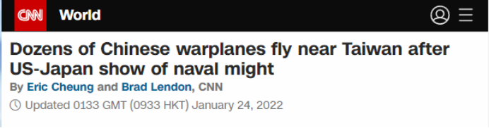 CNN還援引台防務部門的消息稱,1月23日,解放軍的24架(次)殲-16、10架(次)殲-10、兩架(次)運-9通信對抗機、兩架(次)運-8電偵機和一架(次)具有核能力的轟-6轟炸機進入台“防空識別區”西南角。