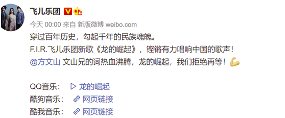 今日零時,飛兒樂團也在微博向大家推薦自己演唱的新歌《龍的崛起》:“穿過百年曆史,勾起千年的民族魂魄。F.I.R.飛兒樂團新歌《龍的崛起》,鏗鏘有力唱響中國的歌聲!”還@方文山 説,“文山兄的詞熱血沸騰,龍的崛起,我們拒絕再等!”