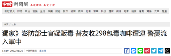 台媒:台軍士官被曝販毒,警方查獲298包毒品並推測部分可能已流入部隊