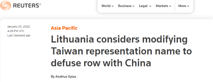 《聯合報》還引述英國金融時報21日報道稱,華盛頓建議立陶宛更名以緩和緊張的立中關係,並稱“台灣代表處”無助“深化台灣和立陶宛的關係”。