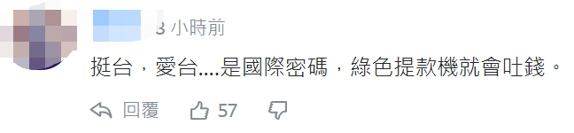 還有網友諷刺,“(台當局)花多少錢買這則廣告?”“‘挺台’,‘愛台’……是國際密碼,綠色提款機就會吐錢”。↓
