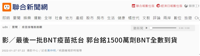 據報道,最後一批抵台的BNT疫苗由台灣華航CI-62航班自德國法蘭克福運回台灣,台“海關”在機坪完成驗放通關程序,直接運送至指定冷儲物流中心進行後續檢驗封緘作業,再提供島內新疫苗接種計劃所列實施對象接種。